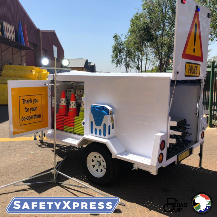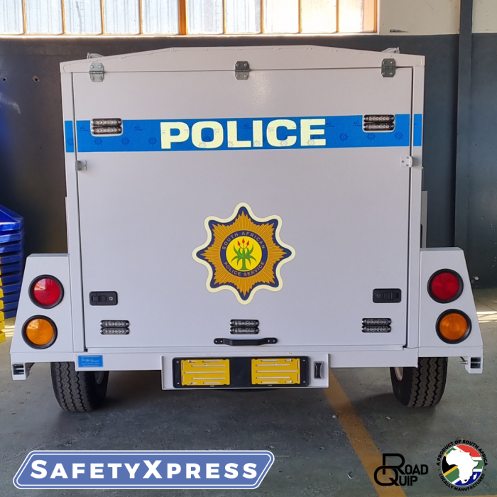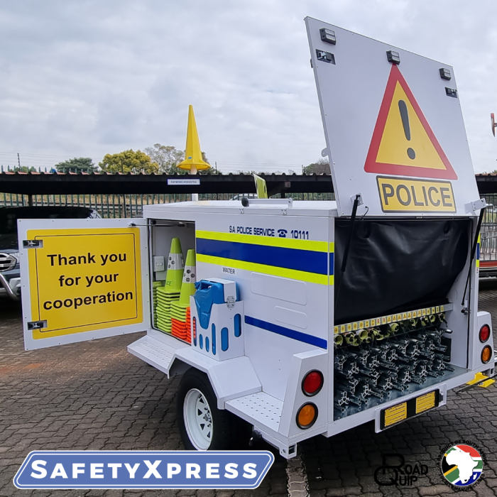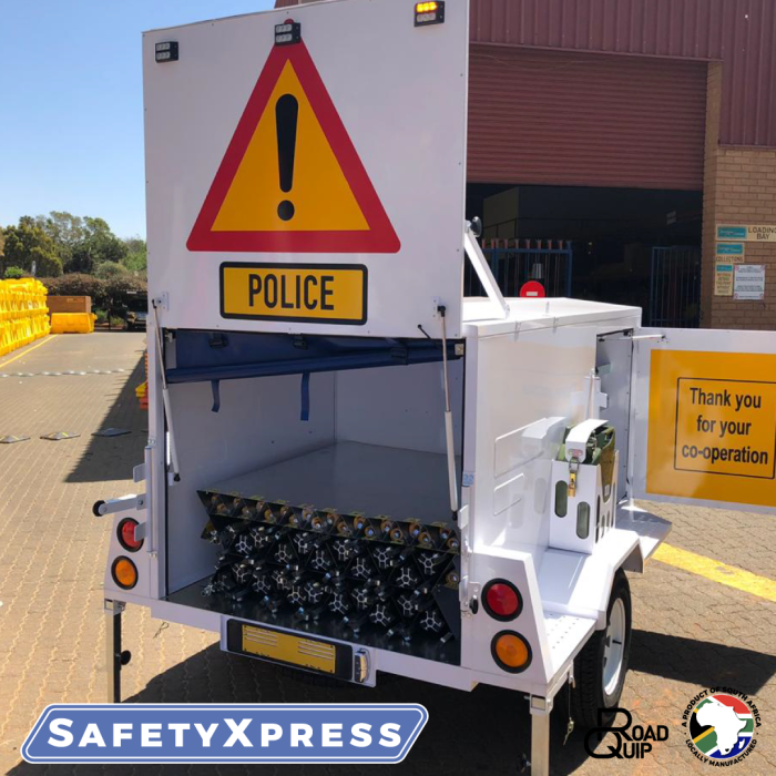 Our lightweight, durable roadblock trailer is a self-contained unit equipped with all necessary roadblock gear for both single and double-lane setups. It is designed for quick deployment by emergency response units and allows rapid access to checkpoints and crime scenes. Each storage location is marked for easy re-packing. Ideal for South African roads with speed zones of 60-120 km/h, the trailer features high-visibility blue flashing LEDs that automatically activate upon opening, ensuring safety and visibility in any situation.